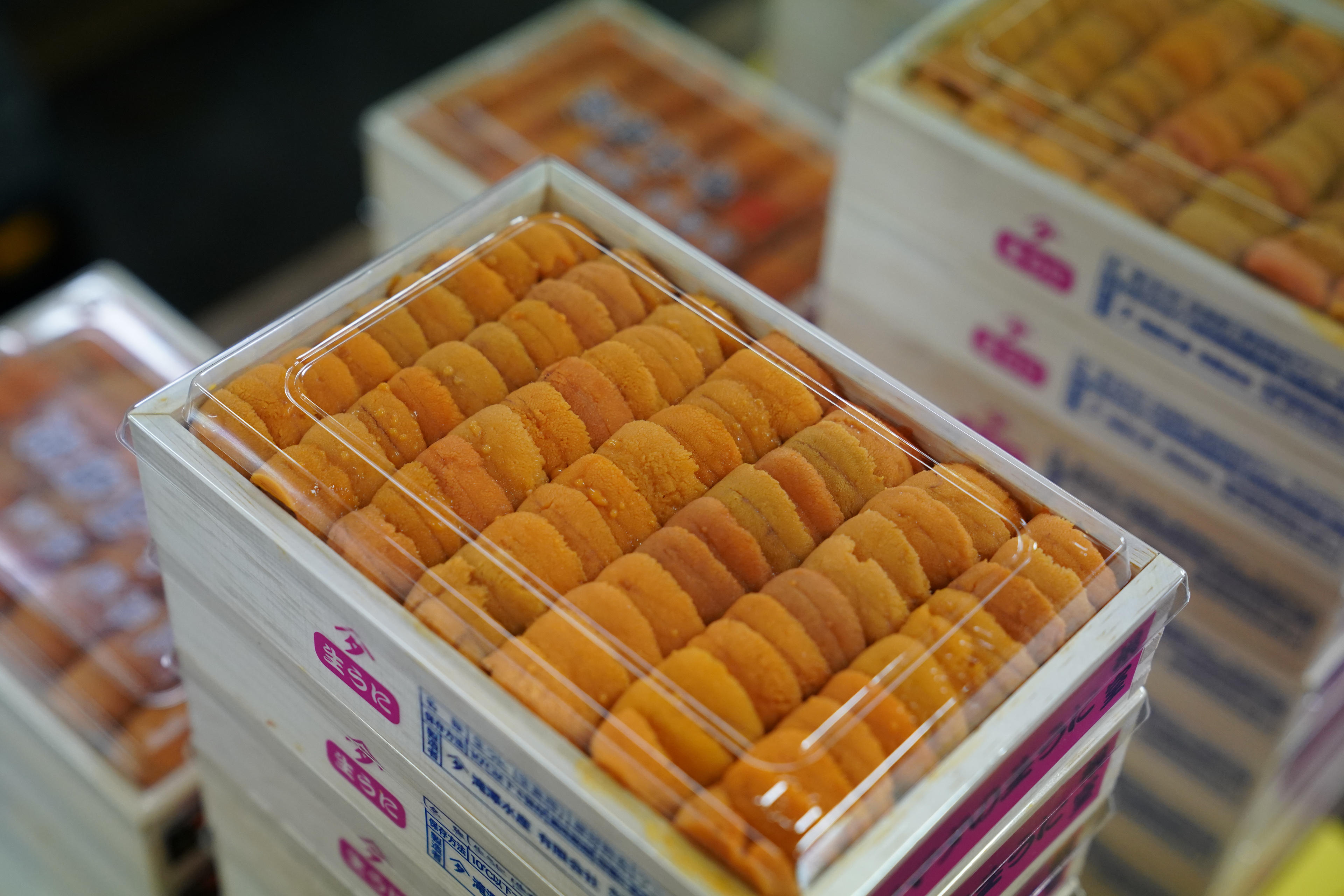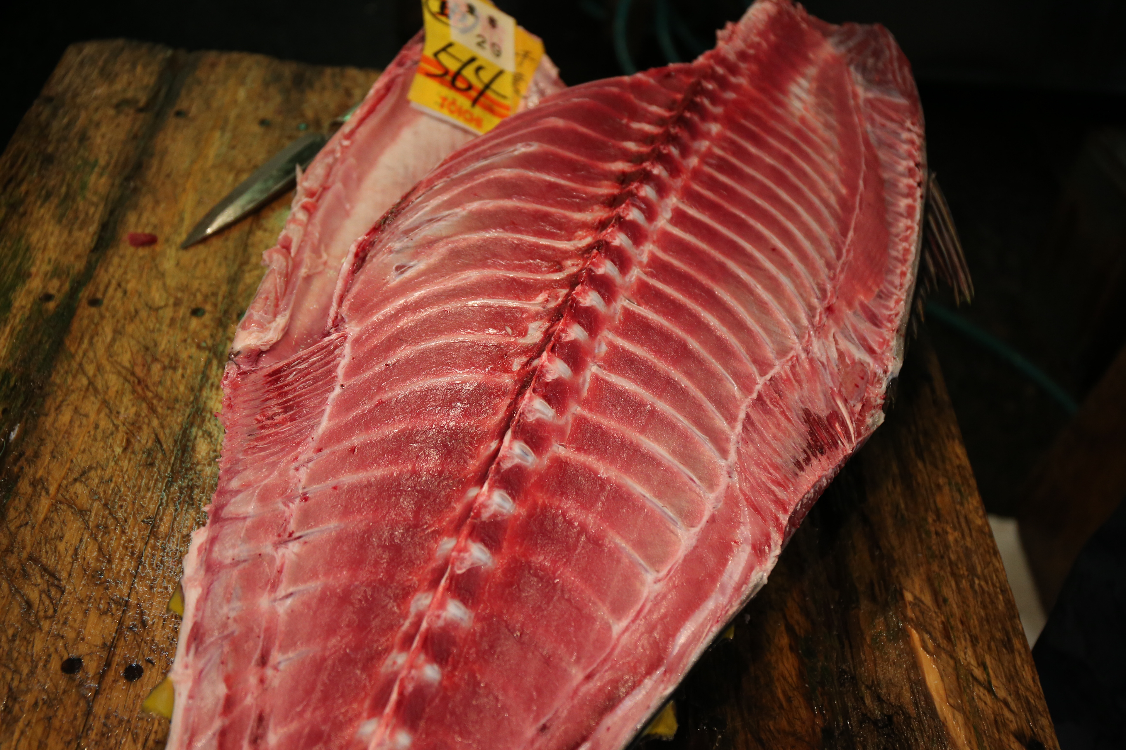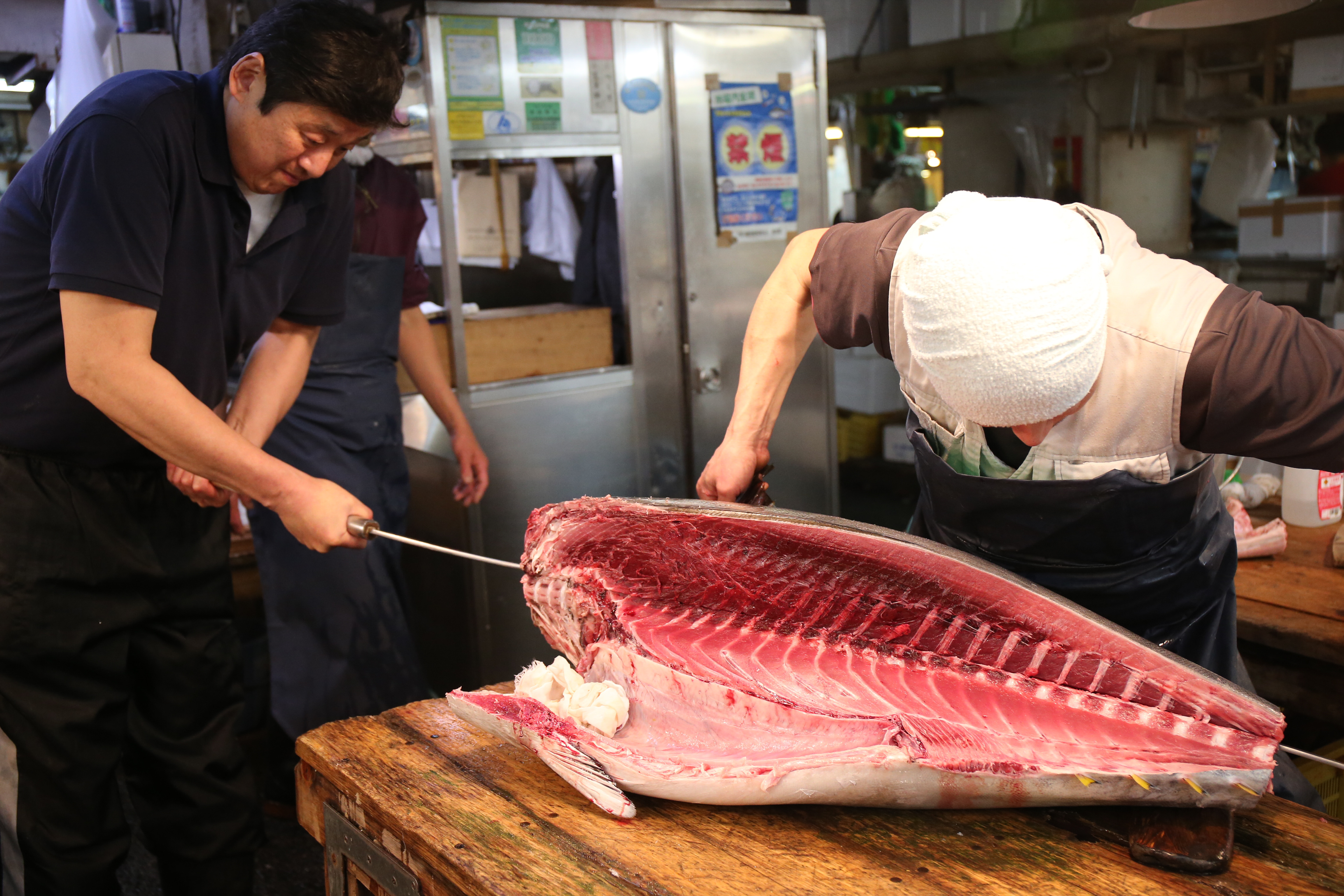 The frozen tuna auction area at Tsukiji Market was a refrigerated hall where buyers inspected massive frozen tuna before bidding. Due to its exposure to outside air, cold and humid conditions sometimes caused the space to fill with white mist, creating an atmospheric scene. Auctioneers called out bids in a fast-paced rhythm as buyers assessed tuna quality. This iconic auction continued until Tsukiji’s relocation to Toyosu Market in 2018.